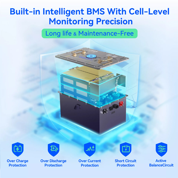 - Its intelligent BMS (Battery Management System) ensures easy installation and minimizes maintenance costs.